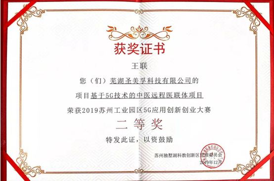 芜湖圣美孚科技公司以“基于5G技术的中医远程医联体项目”参加此次大赛,与参赛的各种人工智能、大数据和物联网等5G示范应用场景的高新科技项目同台亮相,于决赛现场进行了路演,阐述了基于5G技术的中医远程医联体项目成果并接受大赛评委的评审问答,经过一番角逐,我公司参赛的“基于5G技术的中医远程医联体项目”荣获2019年苏州工业园区5G应用创新创业大赛二等奖。