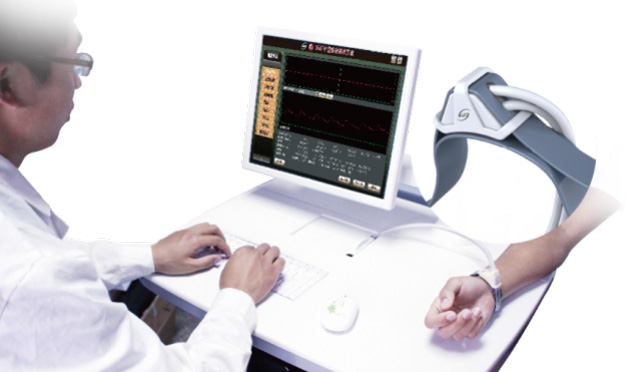 中医脉象诊断系统:利用计算机,通过袖带式传感器,传感器自身重量≤50克,在桡动脉寸,关,尺三个部位检测脉象信号,模仿中医医师指法,(传感器Φ8圆形)更准确的按照中医举、按、寻的诊脉过程,浮、中、沉散布全自动气体加压取脉,采集八个不同压力段的脉象波形自助选择佳压力波形,并将脉象的位,数,形,势和脉图的各项参数自动分析,以判定脉象信息,用于临床脉象检测。